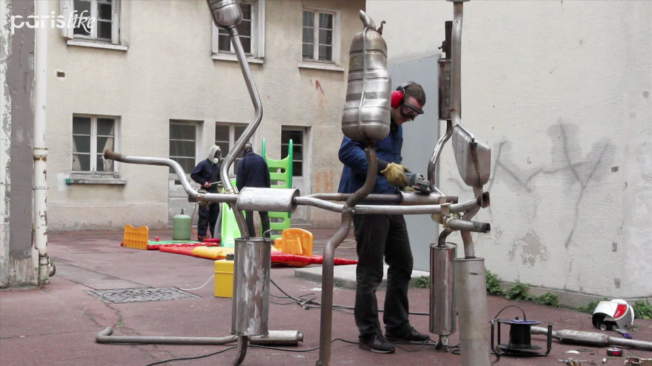 The creation, manufacture and setting up of the works take place locally in the gallery´s backyard. Scattered on the floor are multiple detached parts. The artist´s assistants and collaborators busy themselves around these automobile entrails: steering column, steering wheel and suspensions, exhaust pipes and tubes. The used spare parts are remounted, checked then rearranged. Exhaust wheels, exhaust pipes, suspension crutches. Welding sparks, incandescent flames, light flashes, smoke spurting white flames.