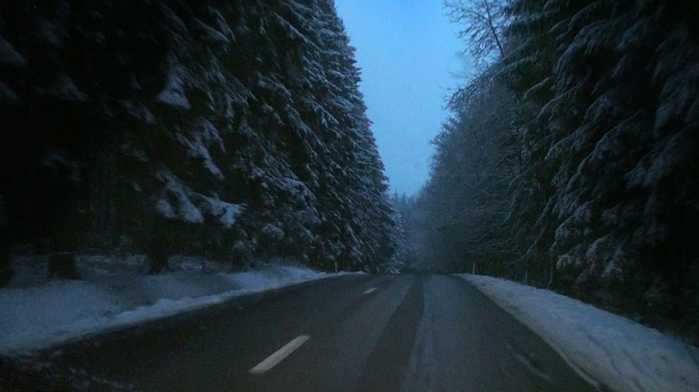 Sitting in the middle of the room, the spectator watches images projected onto the walls: four sequence shots showing a landscape on which a road flashes past. Straight or winding roads, snowy roads, country roads filmed at dusk or night roads lit up by the headlights of a car. While lost in the contemplation of this moving landscape, which disappears and reappears each time identically, the viewer is plunged into a hypnotic place conducive to mental motions. In an almost literal way, this space seems as if occupied by a double vanishing line: the optical vanishing line of the horizon which keeps evading us and the vanishing line moving forward, escaping along a road which seems to be leading nowhere and which Brigitte may follow to better disappear into the immensity of the landscape or into the darkness of the night. The magnetic tape of the answering machine, combined with the landscape, could then play the role of a voice-over device like in the well-known film noir sequence of a famous horror thriller, in which the character of Marion Crane runs away from Phoenix in her car after having stolen 40.000 dollars. During the rainy ride, by day and night, the character imagines voices discussing her theft with hostility. While the character of Brigitte returns us to Marion and the installation Brigitte reminds us, through its scopic drive, of the narrative device and set of Hichcock’s Psycho, the comparison stops here. For Marion is a fictitious character, while Brigitte is a real person.